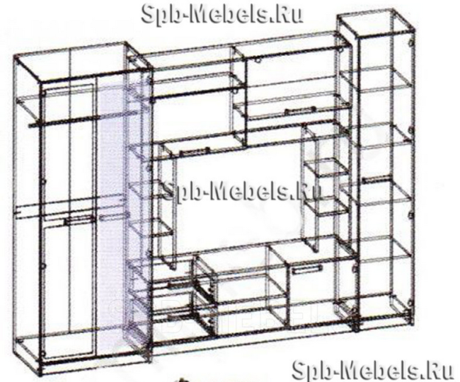 Стенка укомплектована платяным шкафом со штангой и полкой наверху, в нем можно развесить как верхнюю одежду, так и другой гардероб, пенал в стенке имеет отделение с полками на которых вы можете разместить свои вещи.